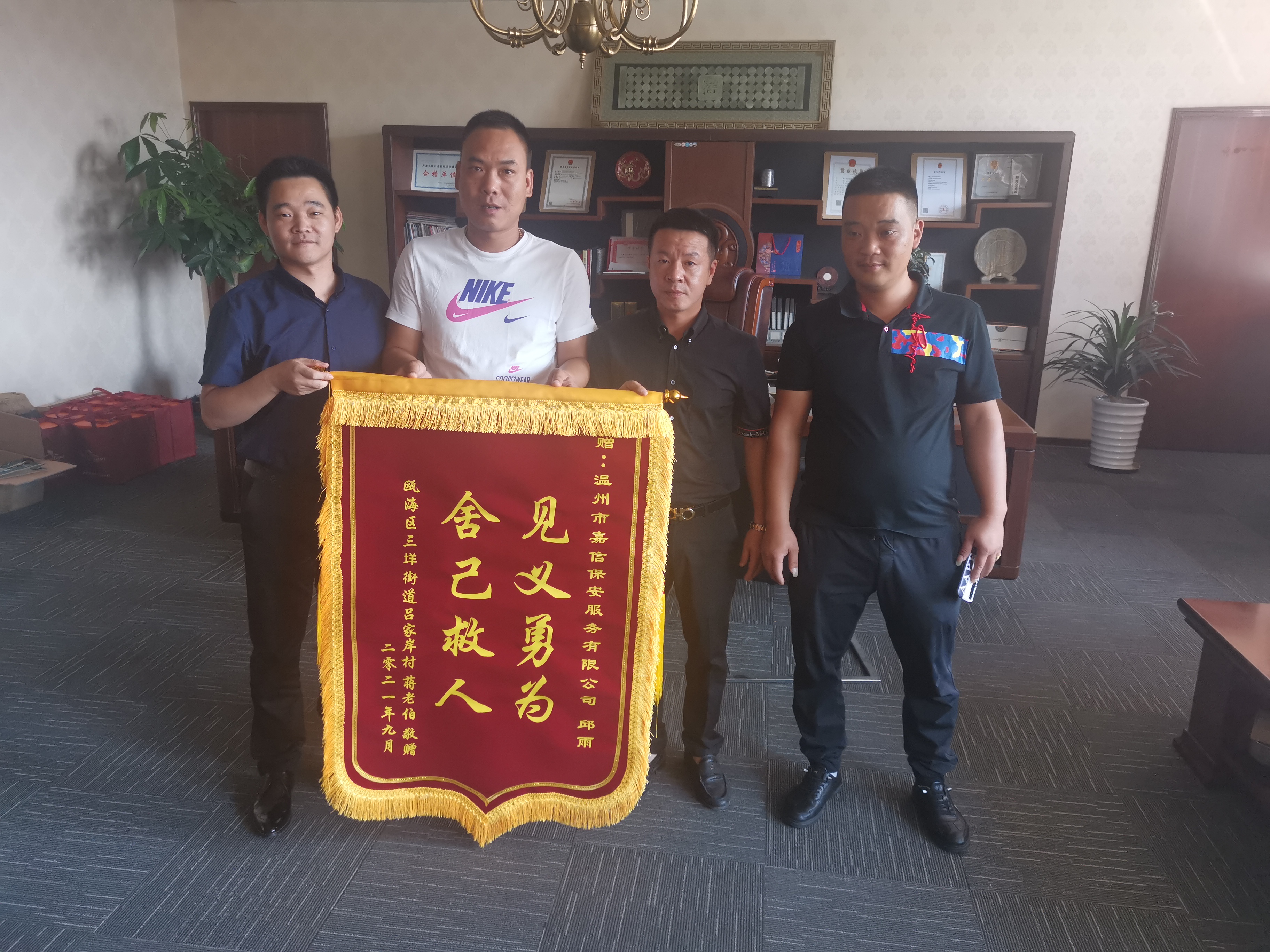 9月16日上午,瓯海区三垟街道吕家岸村蒋老伯委托家属将一面“ 舍己救人 见义勇为 ”的锦旗送到温州市嘉信保安服务有限公司邱雨手中。